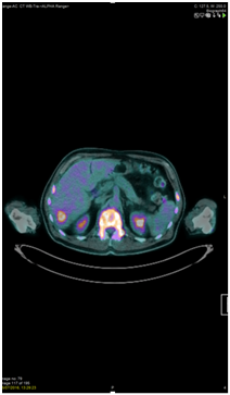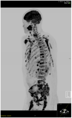 Figure 2 18FDG PET confirming the head and neck primary plus multiple spinal, Sternal, Pelvic, Humeral and Extra-osseous metastases (including liver).