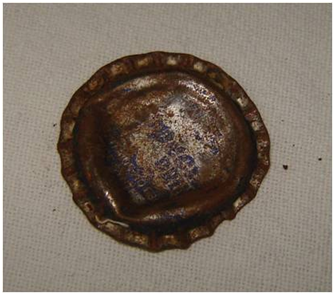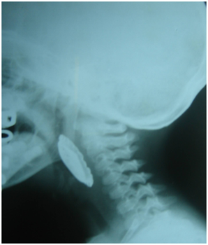 A 14 year old boy presented with difficulty and pain in swallowing for 6 hours. The symptoms started whilst he was playing with a soda cap in his mouth, which he accidently ingested. On examination there was mild tenderness on the neck and minimal drooling of saliva. The x-ray of the neck lateral (Figure 1) and antero-posterior view revealed a radio opaque foreign body in the neck, the level of which ranged from cervical vertebrae 3 to 6. The patient was taken to the emergency operation theatre and the soda cap (Figure 2) was removed using a rigid esophagoscope. There was minimal mucosal injury and the patient was started on oral feeds the next day. He has been asymptomatic at 2 months follow up.