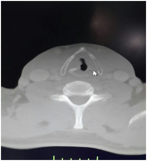 In patients diagnosed with head-neck cancer, anesthesia approach and airway management requires caution. In time, airway may change in patients. In patient in whom securing airway is very easy prior to resection surgery, subsequent to surgery or radiotherapy even mask ventilation may become impossible, because during surgical intervention, anatomic mark points are also resected. Moreover, fibrosis developing postoperatively or after radiotherapy restricts the mobility of the airway. Therefore, intubation with direct laryngoscopy may be difficult and excretion of excessive force may harm intact airway. Radiotherapy has long been used in the therapy of larynx carcinoma. One of the well known complications of this method, used in the treatment of head and neck neoplasms, is radio necrosis. It is possible to encounter tissue necrosis involving soft tissues, joints and bones.3‒8 Chondroradionecrosis is one of the rare and late complications of radiotherapy of larynx cancers and may arise in a large time period ranging between 1 to 50years.1 Two cases reported in the literature as delayed complications, occurred 44 and 50 years later respectively while in the present case this period was four months.