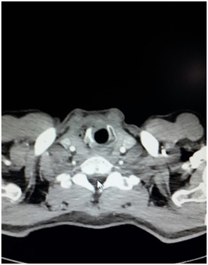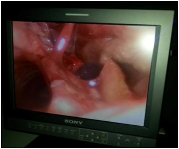 1 year ago, a 52year old male patient was diagnosed T3 glottic cancer and he did not consent to operation and he was underwent radiotherapy of the neck region due to lymph node metastasis (Figure 1). About four months after radiotherapy, halithosis and difficulty in breathing occurred and ear nose throat department planned tracheostomy (Figure 2). Patient had cachectic appearance and anaerobic odor was present. Preoperative SpO2: 82%, blood presure: 140/80 mm/Hg and heart rate: 110 beats/min. In anesthesia induction, 2mg/kg propofol, 0.6mg/kg rocuronium (Esmeron, Schering Plough, Turkey) and 1.5mcg/kg fentanyl (Talinat, Vem, Turkey) were administered. After oxygen saturation value was increased from 82% to 98% with mask ventilation, suspension blade was placed. In endoscopy, it was observed that right side of trachea was necrotic in subglottic region and necrosis extended towards strap muscles (Figure 3). While necrotic areas are cleaned, desaturation was prevented by 100% O2 18 lt/min. flow insufflations. During skin incision for tracheostomy, intubation was made carefully with endoscopy. At the level of 2nd and 3rd rings of trachea, necrotic areas at right lateral were excised and cannula was placed. In the meantime biopsy was taken and tumor didn’t occur in the biopsy result. Patient was awakened without any complications and transferred to clinic.