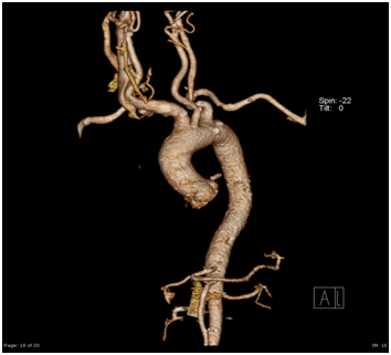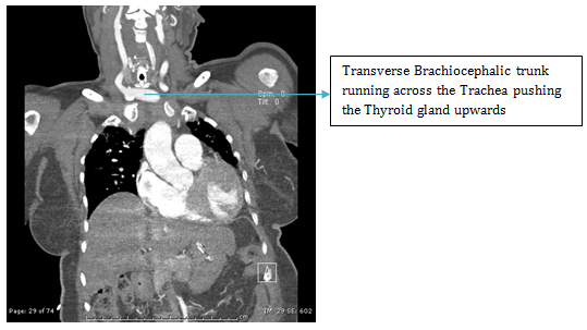 ENT referral was sought and a colour Doppler was advised which showed an abnormal large artery in running across in front of the Trachea. A CT angiography was then done which revealed anomalous Brachiocephalic trunk running from left to right across in front of the trachea which had pushed the thyroid gland to the level of Cricoid cartilage (Figures 1-4).