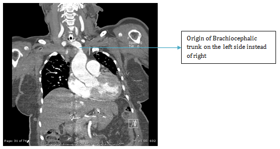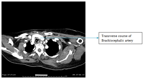 Tracheostomy was then recommended for a large variety of assorted maladies. This started a tremendous period of enthusiasm. Finally, the present era starting in 1965 comes as a period of rationalization. Complications, indications and interrelation with endotracheal intubation are clearly outlined.1 The procedure is mostly straightforward- requires trans cervical exposure of the trachea and an opening is created between the 3rd and 4th tracheal ring. A tracheostomy tube is placed and secured in place with the help of tapes and/ or suture. Life threatening complications can be encountered if anomalous blood vessels get injured during the procedure or in the post operative period if the tip of the tracheostomy tube abuts against and the great vessels of the neck. We describe here a case with anomalous Brachiocephalic artery which made the surgery difficult and prone to life threatening complications.
