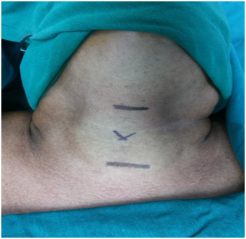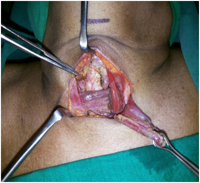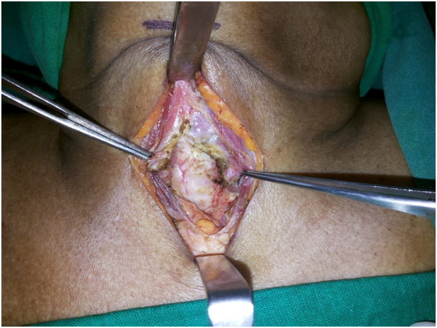 The relatives were explained of the tricky situation and all the risks and complications including the need to abandon the procedure, ligate the main vascular trunk and risk of death on table. We decided to go ahead with transcervical approach with a Cardiovascular surgeon back up in case of massive hemorrhage due to injury to the brachiocephalic trunk.