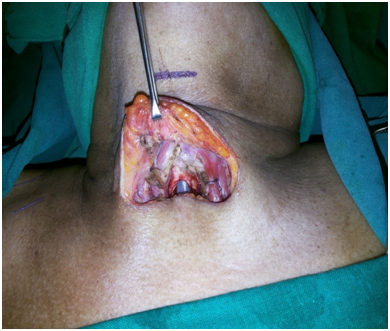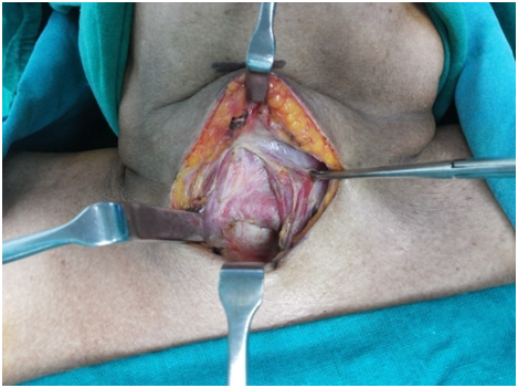 After identifying the landmarks (Figure 5) the neck was explored by a transverse 6 cm incision just on the upper border of the felt pulsation of the vessel. Skin, fat and platysmal incised and upper flap was raised to expose the investing layer of cervical fascia. The lower flap was deliberately not raised to prevent exposing the vessel. This fascia was split in the midline to expose the strap muscles and the isthmus of thyroid gland (Figure 6). The isthmus was split in midline and the edges transfixed to the ipsilateral Sternothyroid muscles (Figure 7). Both sides Sternohyoid muscles were cut at their upper ends, rotated and sutured to the other side (Figures 8&9) sternothyroids making a muscular bed over the horizontally running brachiocephalic trunk just underneath. An inverted “U” flap on the exposed 2nd to 4th tracheal rings was incised and was sutured to the unraised subcutaneous layer of the lower skin flap overlying the vessel hence forming another barrier and a bed for the tracheostomy tube so that it does not rub against it any of the time (Figure 10). Skin incision was closed leaving the opening for the trachoestoma. Portex cuffed tracheostomy tube with suction aid inserted after withdrawing the endotracheal tube.