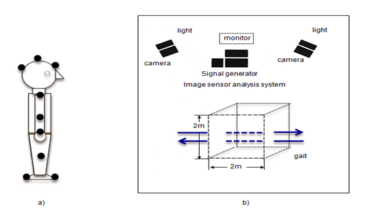 Figure 1 Block diagram of the three-dimensional gait analysis system. A] Markers were placed on the vertex, forehead, and inion and bilaterally on the, shoulder, elbow, wrist, knee, heel, and toe. B] Gait was analyzed over a 2-m3 space at the center of a 4-m walkway. Black circles: positions of reflective markers. Arrows: direction of gait.