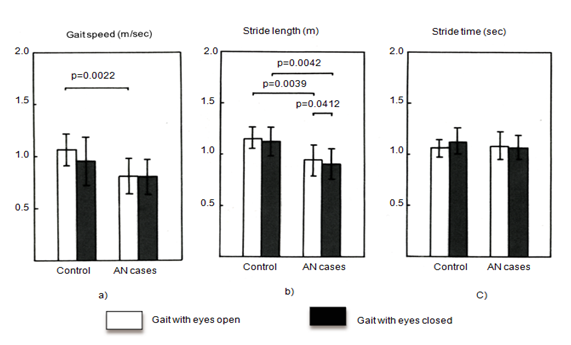 Figure 2 A] Gait speed, B] Stride length, and C] Stride time. Gait speed was lower in the AN group than in the control group in the eyes-open condition; however no difference was present in the eyes-closed condition. Stride length was shorter in the AN group than in the control group. Stride time was similar in the two groups. White: gait with eyes open. Black: gait with eyes closed.