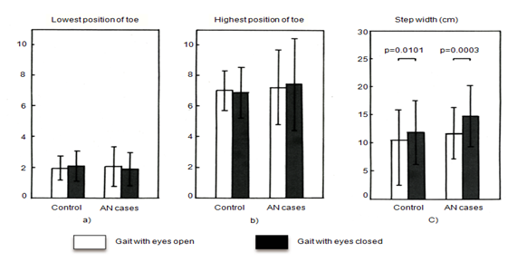 Figure 3 A, B] Toe swing and C] Step width. The lowest and highest positions of the toe during swing were similar in the two group. Step width was wider in the eyes-closed condition than in the eyes-open condition in both groups, but was similar in the two groups.