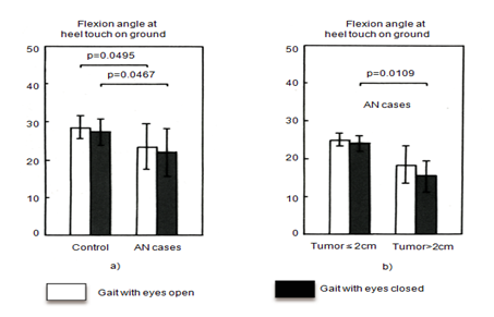 In the present study we placed markers on the head, trunk, arms, waist and feet of the subjects and measured whole-body movements during gait performed with eyes open and eyes closed. Patients with AN had a slower gait with wider step width and shorter stride length, especially when gait was performed without visual input. These minor but significant changes likely reflect the presence of a defense mechanism equipped in our central nervous system against minor functional change which is not clear to the observer. In addition, ankle plantar flexion angle at heel strike was significantly lower in AN patients, especially when gait was performed with eyes closed. This change was even more pronounced in patients with large tumors. These changes were observed in the absence of differences in gait speed, and the decreased ankle planter flexion angle at heel strike could be caused by the presence of the tumor, probably due to a decreased functional level of the lateral vestibulo-spinal tract.14