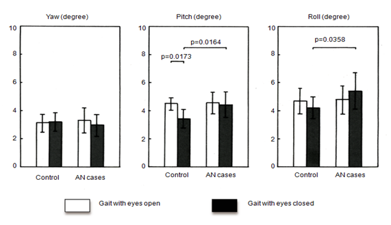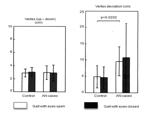 Head movement in the yaw plane was similar in the two groups. However, head movement in the pitch and roll planes was significantly greater in the AN group, especially in the eyes-closed condition (Figure 5). Vertical movement of the vertex during locomotion was similar in the two groups, but horizontal deviation was greater in the AN group (Figure 6).