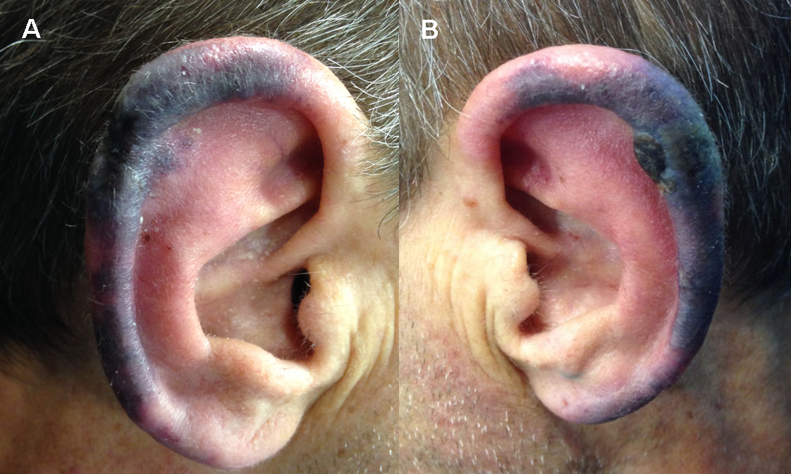 Figure 1 Right (A) and Left (B) auricle showing purpuric disseminated lesions. Notice the small necrotic area in the upper part of the left helix.