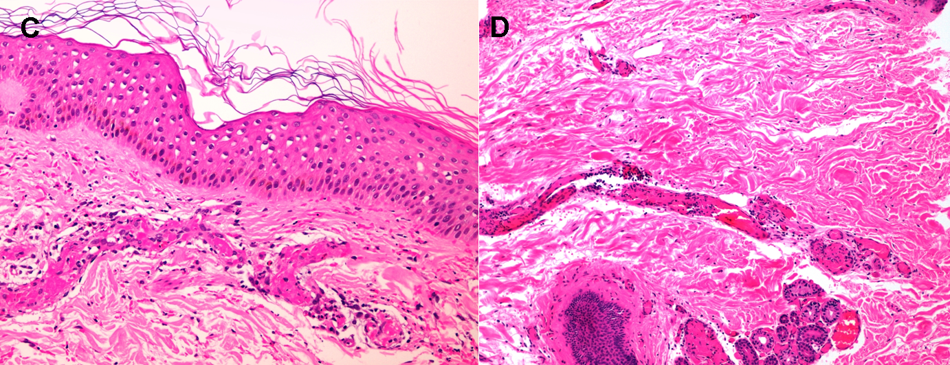 The pathogenesis of this condition is unclear. Cocaine by itself causes intense vasoconstriction which enhances platelet aggregation decreases fibrinolytic activity and activates immunologic mechanisms with consequent vasculopathic effects.7,10 Histopathological features of LIVEN (Levamisole-induced vasculopathy) are occlusive thrombotic vasculopathy with or without leukocytoclastic vasculitis and fibrinoid necrosis.2,4,6 Thrombotic vasculopathy features are characterized by eosinophilic PAS positive deposits in the luminal vessels as can be observed in our Figure 2. Lesions are characterized by being retiform and purpuric with occasional necrotic patches with perivascular lymphocytic infiltrates and ANCA positivity.5,7,9 Characteristic histologic patterns make biopsy very useful in narrowing diagnostic possibilities.9