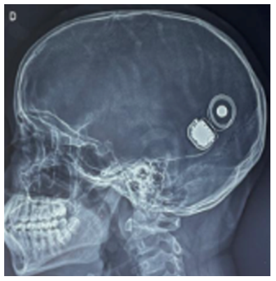 The average duration of hospitalization was 48 hours. Sternvers radiography confirmed the correct placement of the cochlear implant in all patients (Figure 3). Postoperative recovery was uncomplicated. The first adjustment or activation of the cochlear implant was performed one month after surgery (Figures 1 & 2). Speech therapy rehabilitation was regular, with an average of 2 sessions per week. The settings were regularly adjusted and modified thereafter according to the progress in speech therapy rehabilitation (at 1, 2, or 3 months).