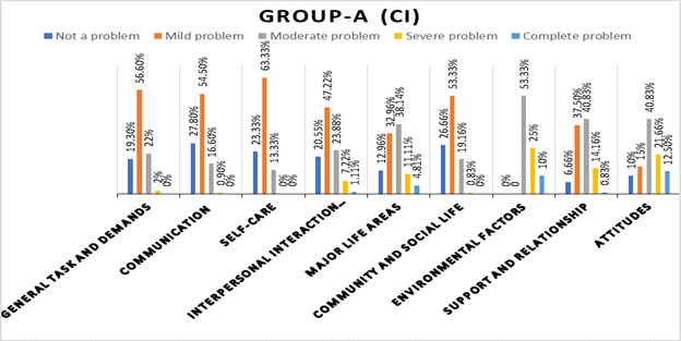 Domain 6- Community, social and civic life: Domain 6 consists of 4 statements about the actions and tasks required to engage in organized social life outside the family, in community, social and civic areas of mother’s life. The minimum and maximum obtainable scores for this domain are “0” and “16” respectively. Maximum frequency is seen for the response “mild problem” i.e. 53.33% for Group A and 44.16% for Group B. Response suggesting that the both group i.e. mothers of children using CI and mothers of children using HA show maximally “mild degree” of difficulty in their community, social and civic life. In this domain, we have observed Group B has higher scores for rating ranging from moderate to complete problem as compared to those of Group A. This suggest that the mothers of children using hearing aid show greater third party disability as compared to the mothers of children using cochlear implant in their “community and social civic life. Mann-Whitney U revealed statically no significant difference between Group A and Group B. (U=273.5; Z= -2.67; P= <.008)