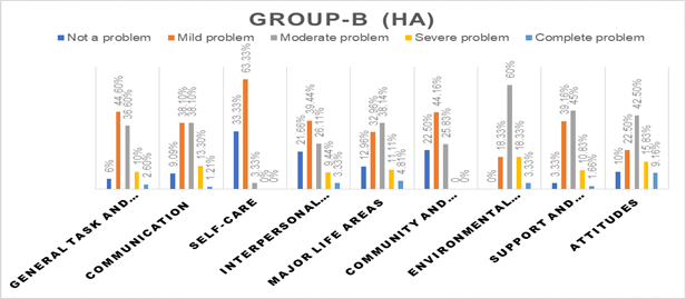 The frequency distribution for each option on the five-point rating scale from ‘No Problem’ (‘0’) to ‘Complete Problem’ (‘4’) was obtained (Figure 1a) & (Figure 1b). For each of the nine domains in Table 1,