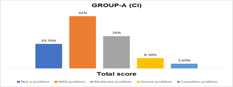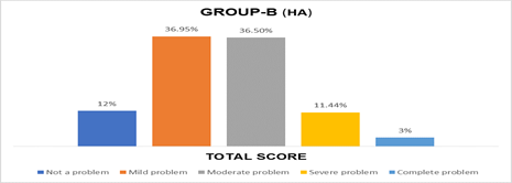The questionnaire consists of a total of 46 statements. The minimum and maximum obtainable total scores thus are 0 and 184 respectively. The maximum obtained score for Group A is 71 and Group B is 82. Maximum frequency is seen for mild problem, while for HA group maximum frequency is seen for moderate problem. More mothers from HA group have provided ratings as severe problem as compared to mothers from CI group. This suggests that the mothers of children using hearing aid shows greater third-party disability as compared to the mothers of children using cochlear implant. Independent Sample t-test indicate that the obtained p value is<0.05, suggesting that there is significant difference in the average total scores of the two group in (Figure 2(a)) & (Figure 2(b)) (t= -7.02; df=58; p=<.001).