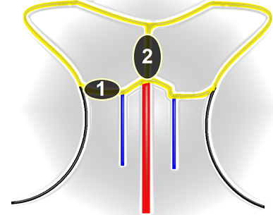 Figure 1 Schematic view of the procedure. (1) bone between the orbital plate of the ethmoid bone (lamina papyracea) and the middle turbinate is removed followed by; (2) removal of the intersinus septum. Image courtesy of Gorazd Poje, MD.