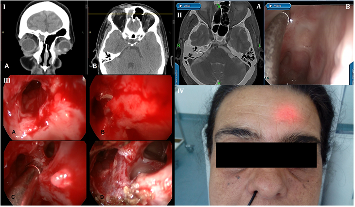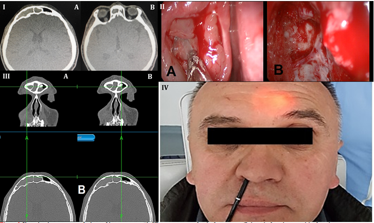 Figure 2 Clinical and intraoperative findings of the patient case #1. CT scan two years after the first surgery. (I) the right frontal sinus and the frontal recess is completely blocked by inflammatory tissue: (A) polypous tissue from right ostiomeatal complex; (B) signs of ethmoidectomy. (II) the right frontal sinus is opened – the aspirator is pointed toward the point for drilling toward the opposite sinus: (A) drilling toward the intersinus septum; (B) the left frontal sinus can be seen after the intersinus septum is removed (both frontal sinuses communicate). (III) navigation probe in the right (A) and left frontal sinus (B). (IV) contralateral frontal sinus endoscopy is be performed by a flexible endoscope through the right frontal sinus extended ostium. Illumination of the left frontal sinus through the anterior wall.