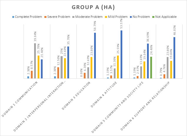 1-Communication, 2-Interpersonal Interaction and Relationship, 3- Education, 4-Attitude, 5-Community and Social Life, 6-Support and Relationships. The 6 domains are assessed based on 43 statements with a 5-point response scale ranging from “Complete problem” rated as 4 to “no problem” rated as 0. Higher ratings/scores suggestive of greater third-party disability.