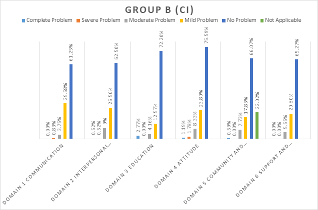 Communication: Receptive Communication is most often an auditory phenomenon. With a CI, children with HI develop better listening skills, better language skills, and good speech intelligibility. As such normal hearing siblings of children with CI resulting in development of good verbal communication skills and good speech intelligibility. As such normal hearing siblings of children with CI show less difficulty in communication compared to siblings of children with HAs. Shivprakash et al.30 studied performance of children having severe to profound hearing loss using hearing aids and cochlear implant. The results demonstrated that implanted children comprehend and express language in much easier ways as compared to children with hearing aids. They also have reported that children with CI take less time to learn language as compared to the children with hearing aid. This supports the findings of the current study reporting less third-party disability for the domain in communication in normal hearing siblings of children with CI as compared to those with hearing aids.