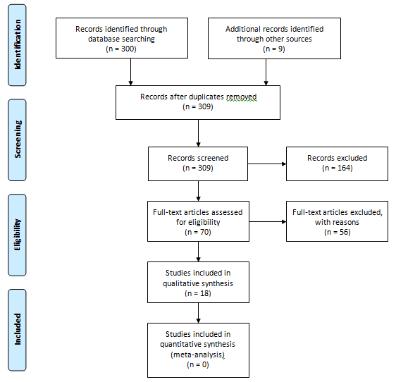The initial search yielded 309 articles. After applying inclusion and exclusion criteria, 18 articles remained (see process in PRISMA diagram in Figure 1. Table 1 describes the instruments used to assess the extent of the neuromuscular diseases encountered in the course of the review, including information source and limitations. Table 2 does the same for instruments used to measure dysphagia relative to this review. Of the 18 articles available for qualitative review, 13 were specific for PD, and 5 were specific for ALS. The search did not yield any papers that studied the progression of Multiple Sclerosis or Huntington’s disease over time with respect to functional status or dysphagia. Table 3 summarizes the findings of the 18 papers reviewed in this study. A formal meta-analysis was not able to be performed based on the spectrum of study criteria.