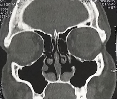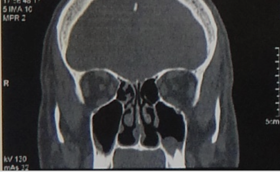 This case describes a technique of insertion of costal cartilage graft through an incision in the deep of sulcus gingiva and lip superior at the level of pyriform aperture, detachment of mucoperiosteal and building a pocket that where will be inserted the graft. After diagnosed the ENS, clinically and using the 6-item questionnaire (ENS6Q), a CT is necessary for planning the surgery, where we can observe a total inferior nasal turbinate removed Figure 1.