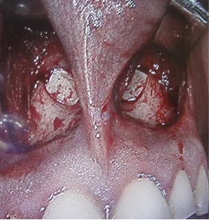 Figure 3 Close of operative view of implants placed along the lateral nasal wall just behind the piriform aperture and under the periosteum of the nasal mucosa.