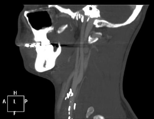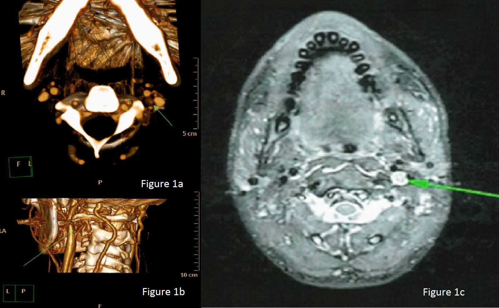 Figure 1a 3D-reconstructed Axial Computed Tomography Angiogram image demonstrating a small mass in the left carotid triangle.