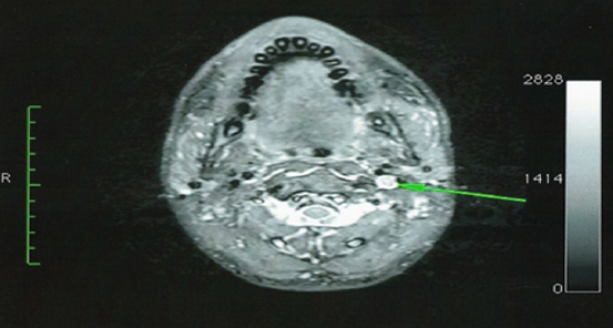 Figure 1c Axial contrast-enhanced T1-weighted Magnetic Resonance Imaging shows an avidly enhancing mass in the left carotid space.