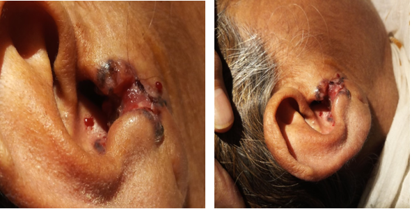 The tumor is a scaly, indurated, irregular maculo-papular lesion that shows an exo- or endophytic growth with hyperkeratotic or ulcerating surface accompanied by serosanguinous exudate which is similar to this patient. As it originates from the external auditory canal having hemorrhagic otorrhoea which is similar to this patient, it is falsely considered to be otitis externa due to which this patient was treated at many places on similar lines showing no response to treatment anywhere, until this visit to our ENT OPD setting. Suspicion arises when this condition fails to respond to conservative line of treatment and hence mandates for biopsy as in this patient. SCC lesions on nose and ear have highest tendency of recurrence as its close association with embryonic fusion planes and requires aggressive therapy.