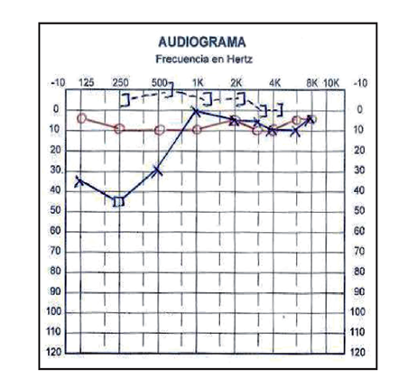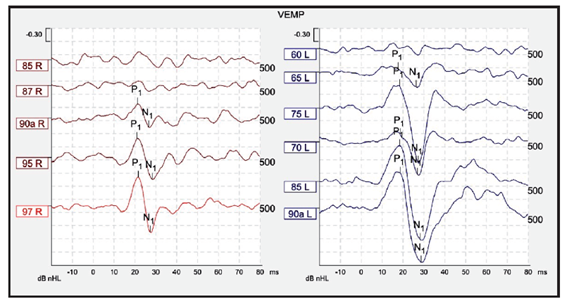 Male patient 33years old, administrative mining. Browse box two years of evolution characterized by hearing loss and tinnitus pulsatile autophony left ear. In the past eight months imbalance and vertigo goal by issuing the phoneme "mmm" is added. The review highlights otoscopia standard; Weber test lateralized to the left ear. Audiometry, hearing loss presents driving left ear upward curve and a gap of 40dB (125-250-500Hz), bone conduction -10dB (Figure 1). With clinical and audiological suspected DCSS VEMP is requested stimulus Burst 500 Hz, which has a threshold of p13 waves and n23 to 65 dB nHL and asymmetry in the amplitudes of the p13 waves and n23 to 90 dB NHL (Figure 2).
