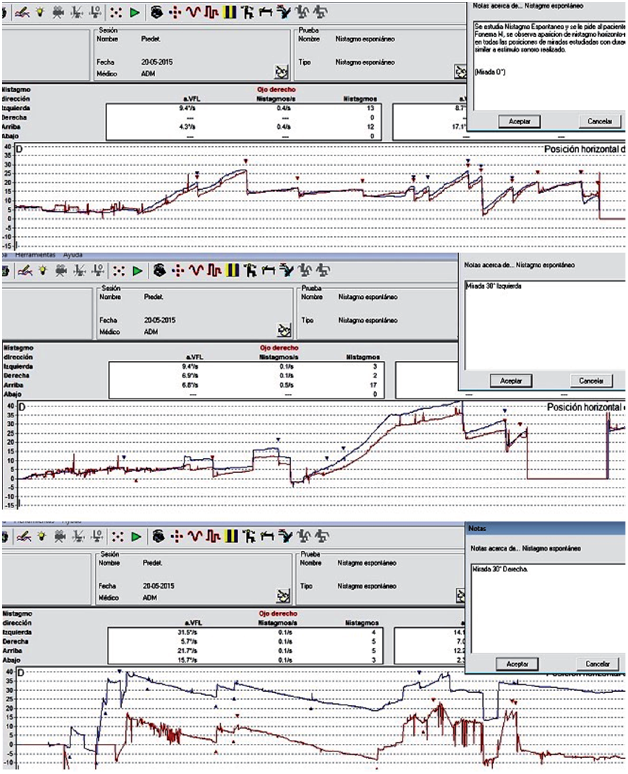 The video presents ausen-cia oculonistagmografía spontaneous nystagmus. The patient is asked to perform phoneme "mmm" observed appearance of horizonto-rotary nystagmus in all positions look, clockwise (Figure 3). A significant caloric testing left vestibular hyperreflexia seen as parameter.