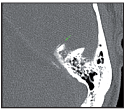 Figure 4a Reconstrucciónn MPR oblique parallel to the plane of the tympanic tegmen. Level window 600 and window width UH 2500 UH. The green arrow indicates the CSCS lacking its superior bony wall.