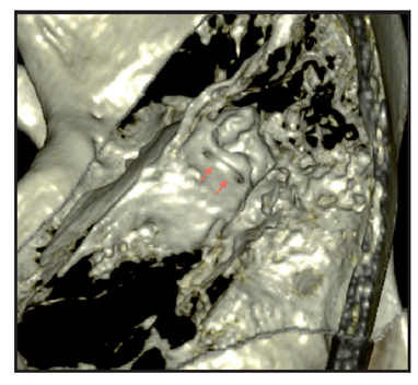 Figure 4b Rendering reconstruction volume highlighting the defect adjacent to the upper wall of CSCS, shown by arrows 4c rojas. Figure bone surface. MPR oblique parallel to the plane of the CSCS which highlights the ósea.VCL wall dehiscence. With the clinical suspicion of DCSS syndrome in left ear temporal bone CT is performed, with cuts of 0.5 mm, which confirms the clinical diagnosis.