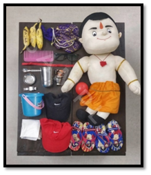 Pilot Study: A pilot study was conducted to ensure that the stimuli prepared were appropriate for 18 to 48-month-old children, the children could follow the instructions and could carry out the task of manipulating the toy as required. This was done on 10 normal hearing children – two from each sub group of 18+ to 24 months, 24 + to 30 months, 30+ to 36 months, 36+ to 42 months and 42+ to 48 months. For pilot study the stimuli were presented orally. Children were explained the task, they were instructed to listen to the full sentence and then to manipulate the toy as required. It was established that the children could follow the tasks appropriately. No further changes were made in the developed stimuli. The final test kit was then prepared in a bag containing the Chhota Bheem toy and the props to be used for the manipulation as per the stimulus sentences and is shown in the Figure 1 below.