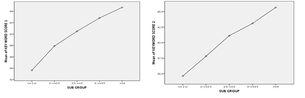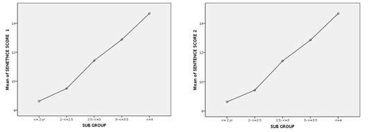 The mean key word scores for sentence List 1 and List 2 for the different sub-groups are also depicted in Figure 2 There is a steep increase in scores from sub-group 1 to sub-group 2. Further ahead there is a constant increase as the age progresses. Ceiling scores have been obtained by four years of age. ANOVA indicated that the difference in mean scores of the 5 sub-groups is statistically significant (p=.000). Bonferroni tests for multiple comparisons reveal that the mean scores of each sub-group differ significantly (p=.000) from that of the other sub-groups.