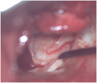 Cartilage shield tympanoplasty (CST) has been described and used in recent times with good success rates.11,12 The technique uses a piece of tragal or conchal cartilage from ear as grafting material and making a notch in its superior aspect to accomodate handle of malleus. Modified version of CST would avoid making a notch and putting the cartilage piece directly lateral to incudo-stapedial (IS) joint, medial to handle of malleus and supporting the graft from medial side by gelfoam pieces (Figure 1).13 Temporalis fascia can also be used in combination with cartilage piece.