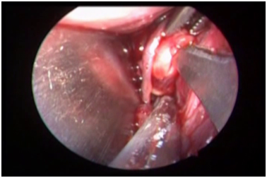 Blunt dissection was performed until the lingual nerve and Wharton’s duct were identified. At this level, lingual nerve appears as a white string located laterally to the Wharton duct. The lingual nerve was isolated and preserved. The glandular hilum was moved upward by an external finger pressure of submandibular gland (Figure 2).