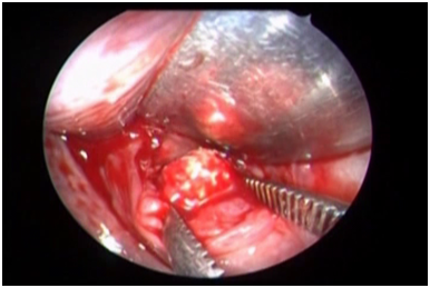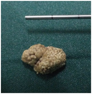 The surgeon proceeded with dissection until parenchymal gland viewing. In order to reach and remove the stone, an incision of glandular parenchyma was performed as much medial to the glandular hilum as possible. The dissection proceeded until the viewing of the stone site. The stone was removed using a curved artery forceps (Figure 3). The stones in the proximal part of duct were removed by incising the duct. The incision made in the duct was closed with 4-0 absorbable sutures. After stone removal, a second sialoendoscopy was performed in order to check for any residual intraparenchymal calculi and duct was irrigated with antibiotic and steroid solution. A sialostent was positioned under sialoendoscopic viewing from the distal to the proximal portion of the duct and it was left in place for at least 3weeks. Finally, the oral floor wound was sutured with resorbable stitch. All patients were discharged 1day after surgery and received antibiotic therapy and steroid for 1week.