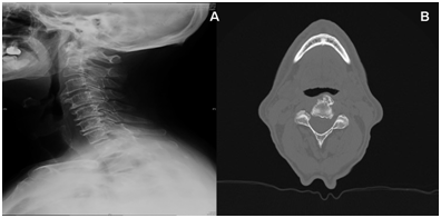 Figure 1A: Lateral cervical X-Ray image B: CT axial view; both showing hyperostosis of the cortex along the anterior surface of the vertebrae. Gradually, elongated osteophytes occur at the anterior margin of the vertebrae and grow across the disc space.