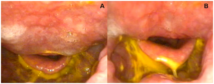 Figure 2A, B Endoscopic view during a dysphagia clinical assessment of a patient with Forestier’s disease. Notice the minimum space between the epiglottis and the posterior pharyngeal wall