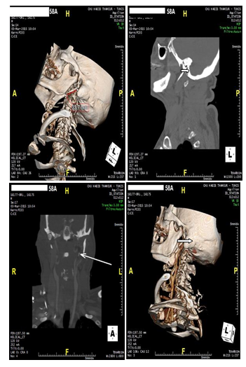 Patient 58 year old smoker, hypertensive, diabetic, dyslépidémique the history of ischemic cerebrovascular accidents for 10 years. CT angio TSA was performed as part of an exploration of atherosclerotic plaques objectified on Doppler ultrasound of TSA and accidentally shown an elongated styloid process measuring 33 last mmWG is closely related to the carotid artery external but also internal carotid artery Figure 1.