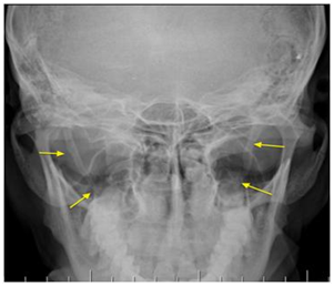 The dental panoramic should be interpreted with caution due to high radiographic magnification level of the patient's inclination in the radio.