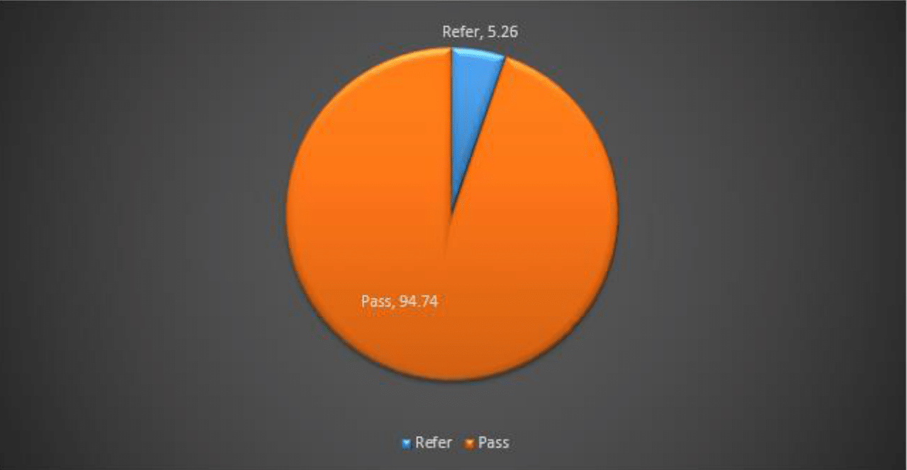 In this study sample size which was included in the OAE test was 532 infants who were attending audiological department and NICU from day 1 to 1 year of age, 504 of them pass the OAE test and 28 infants refer (not pass the test).