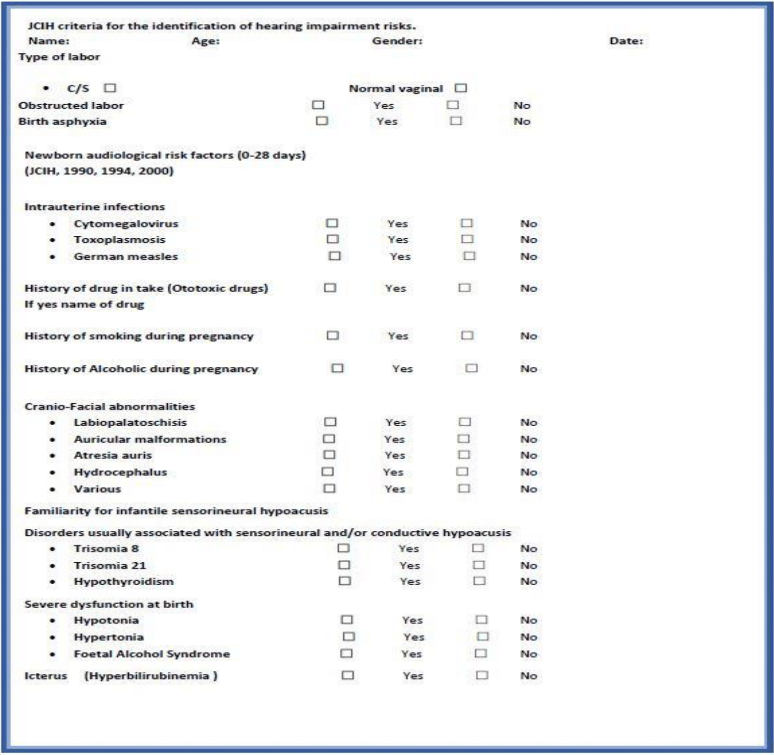 The infants was assessed by taking a short history from their parents , concentrating on Joint Committee on Infant Hearing (JCIH) criteria which is used for the identification of risky infants to have hearing impairment and all the records had been reported in a questionnaire paper, which was designed in a way that the data can be easily reached.