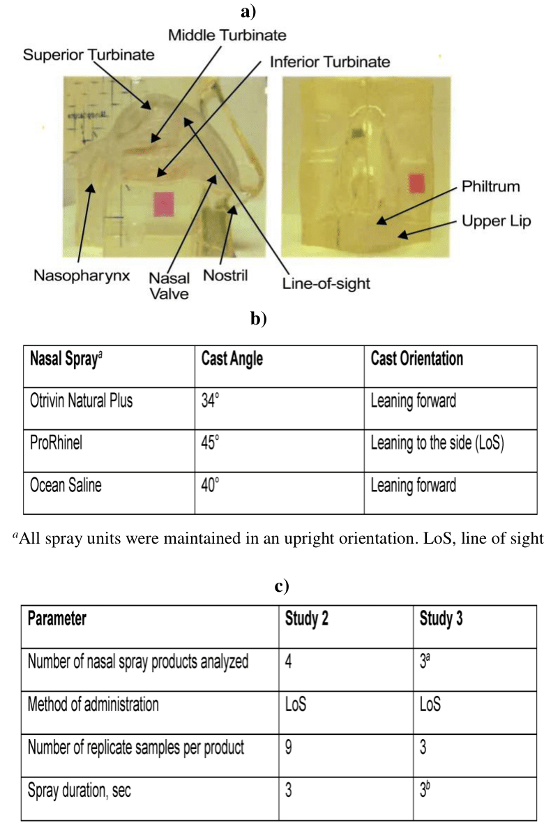 Figure 1 ThreeOverview of the design of Studies 1–3. (a) sagittal and frontal views of the nasal cast. (b) cast positions for nasal sprays analyzed in Study 1. (c) methods of Studies 2 and 3.