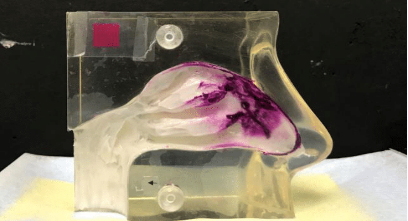 Each nasal spray unit was inserted approximately 1/2 inch (~1.27 cm) into the nostril, per the package insert. The angle and orientation of the nasal cast for the assessment of each product are shown in Figure 1b. All units were actuated manually, and the nasal cast orientation was maintained for approximately 10 to 20 seconds after each actuation. The artificial mucus changed color from white to pink when exposed to the water contained in the spray (Figure 2).