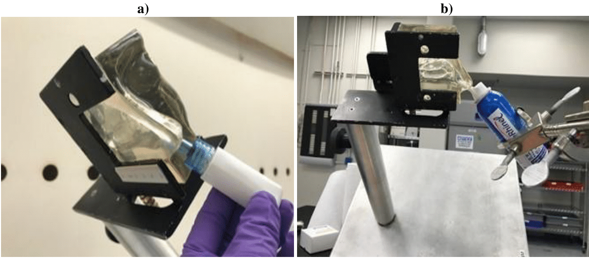 In both studies, Urban Dust PM was introduced into the mucus-coated nasal cast cavity with a nasal powder insufflator (Dry Powder Nasal Insufflator provided by Next Breath LLC, a division of AptarGroup Inc., Baltimore, MD; Figure 3a). Spray deposition in the turbinate region was achieved with the LoS method of administration (nasal cast tilted sideways 45°, spray angle 0° from vertical; Figure 3b); each unit was actuated manually to rinse off the PM.