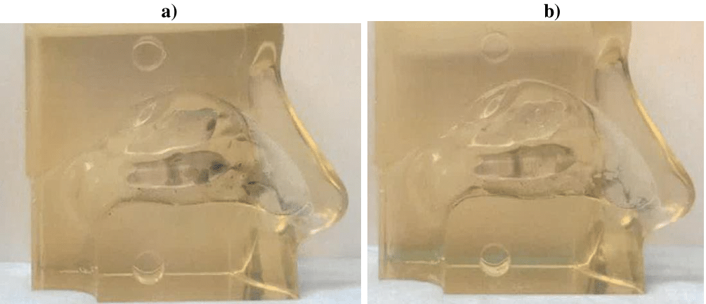 Figure 5 Nasal saline washing of a nasal cast coated with PM Urban Dust in Study 3. (a) before nasal washing with Otrivin Breathe Clean Nasal Spray. (b) after nasal washing with Otrivin Breathe Clean Nasal Spray administered in the LoS direction.