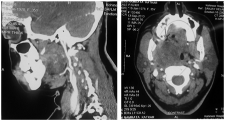 Patient: A 35year old female came for evaluation of right tonsillar fossa swelling of 1year duration. The CT showed a mixed density nodular lesion occupying right parapharyngeal space.