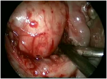 After proper exposure of the oral cavity by using a Boyle-Davis gag, a transoral pharyngotomy was performed by linear-vertical incision through the overlying mucosa, buccopharyngeal fascia and pharyngeal muscle. Dissection had been carried out down to the level of the tumor. It was performed with assistance of 0 and 30 rigid endoscopes. A combination of sharp and blunt dissection was used to expose and completely free the tumor from surrounding structures. Blunt dissection was done on capsule (endoscope assisted) and care was taken not to rupture it. There was no damage to surrounding nervous structures or vasculature. The tumor was dissected en bloc under direct endoscopic visualization (Figure 2). After ensuring there was no residual tumor, the pharyngotomy was repaired in layers. The patient was discharged home on the next day of surgery with total blood loss less than 20ml.